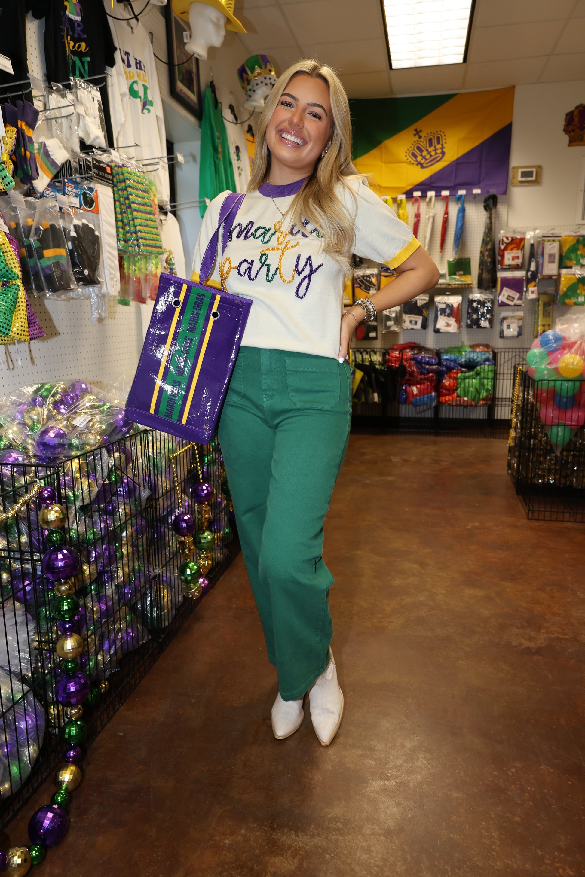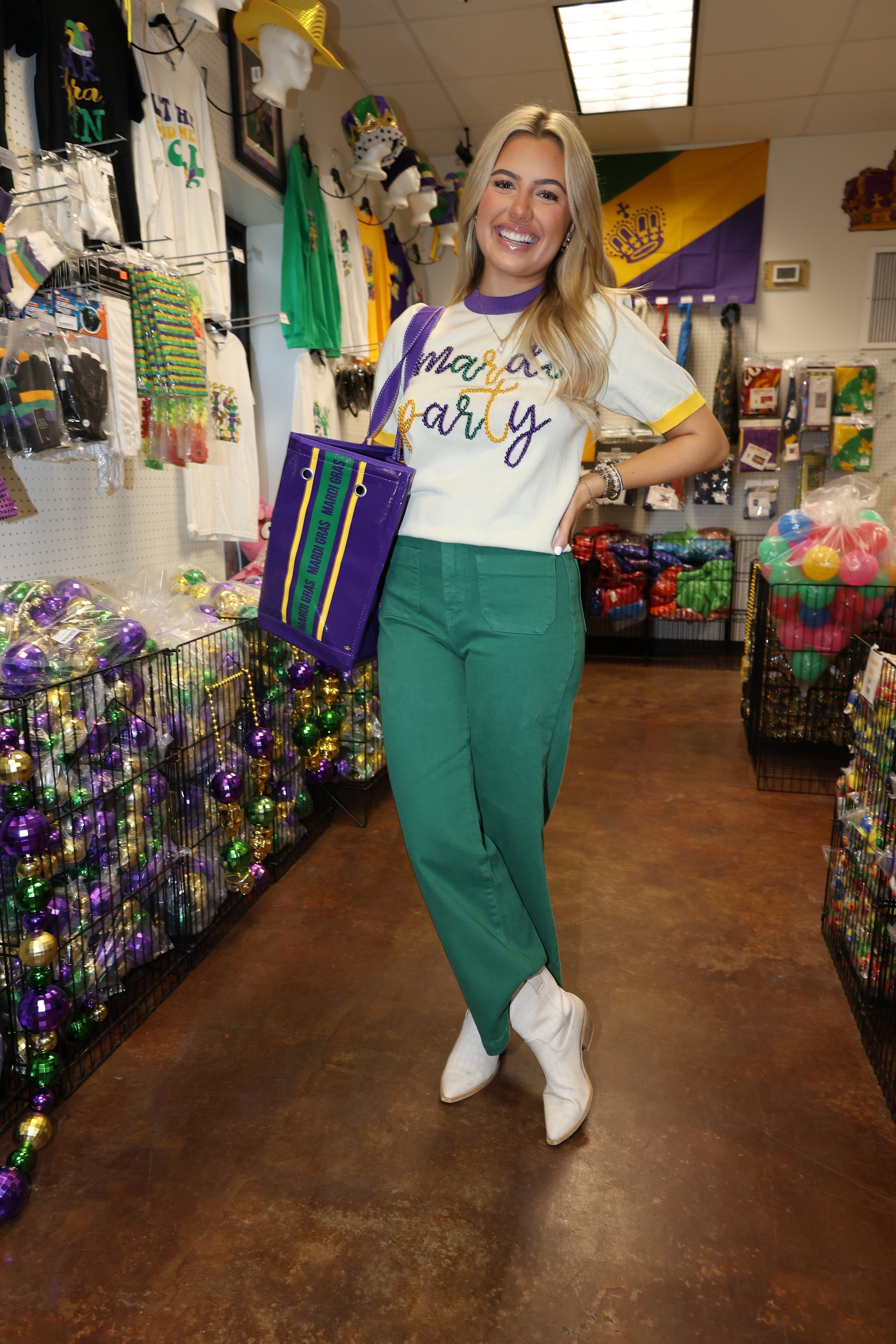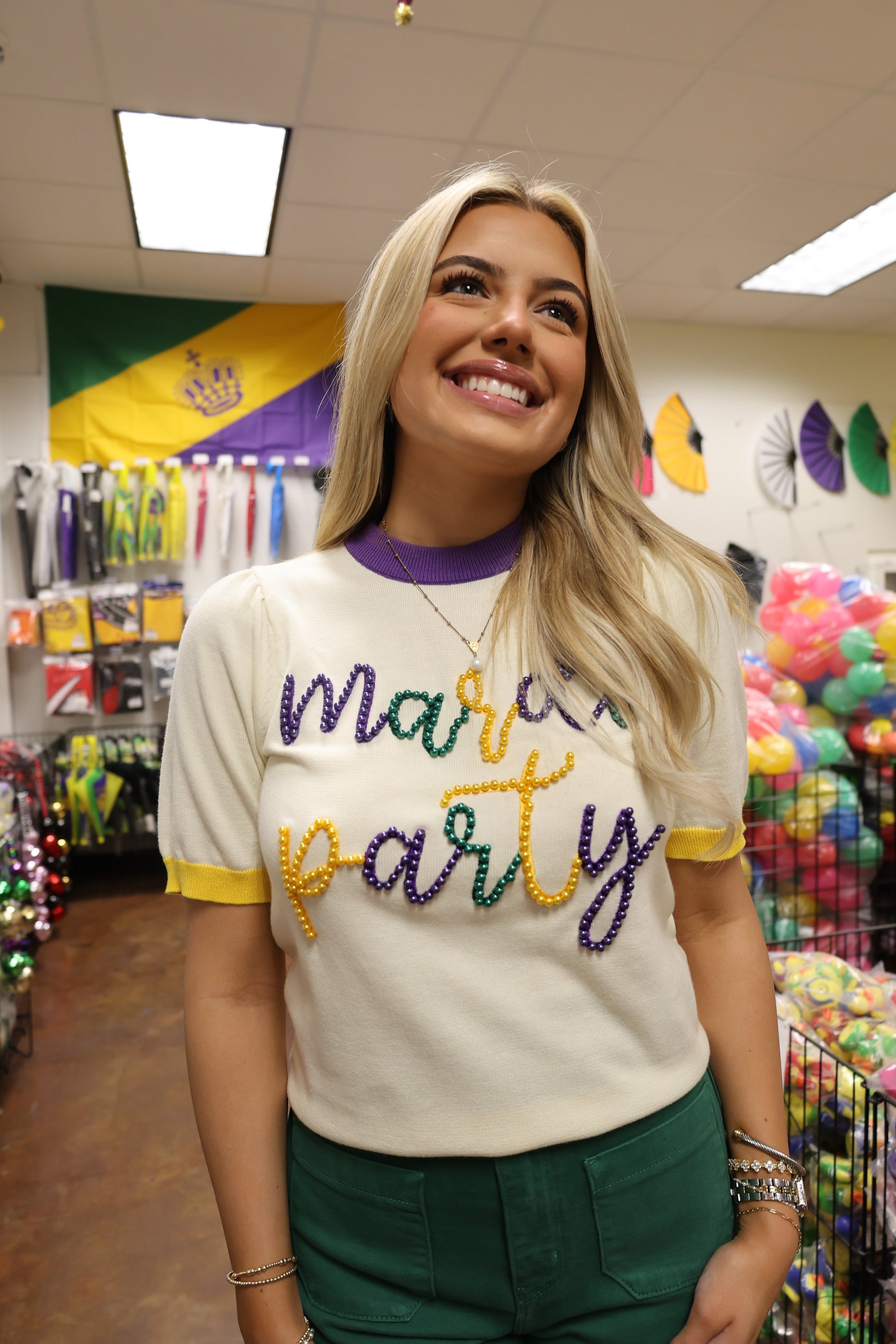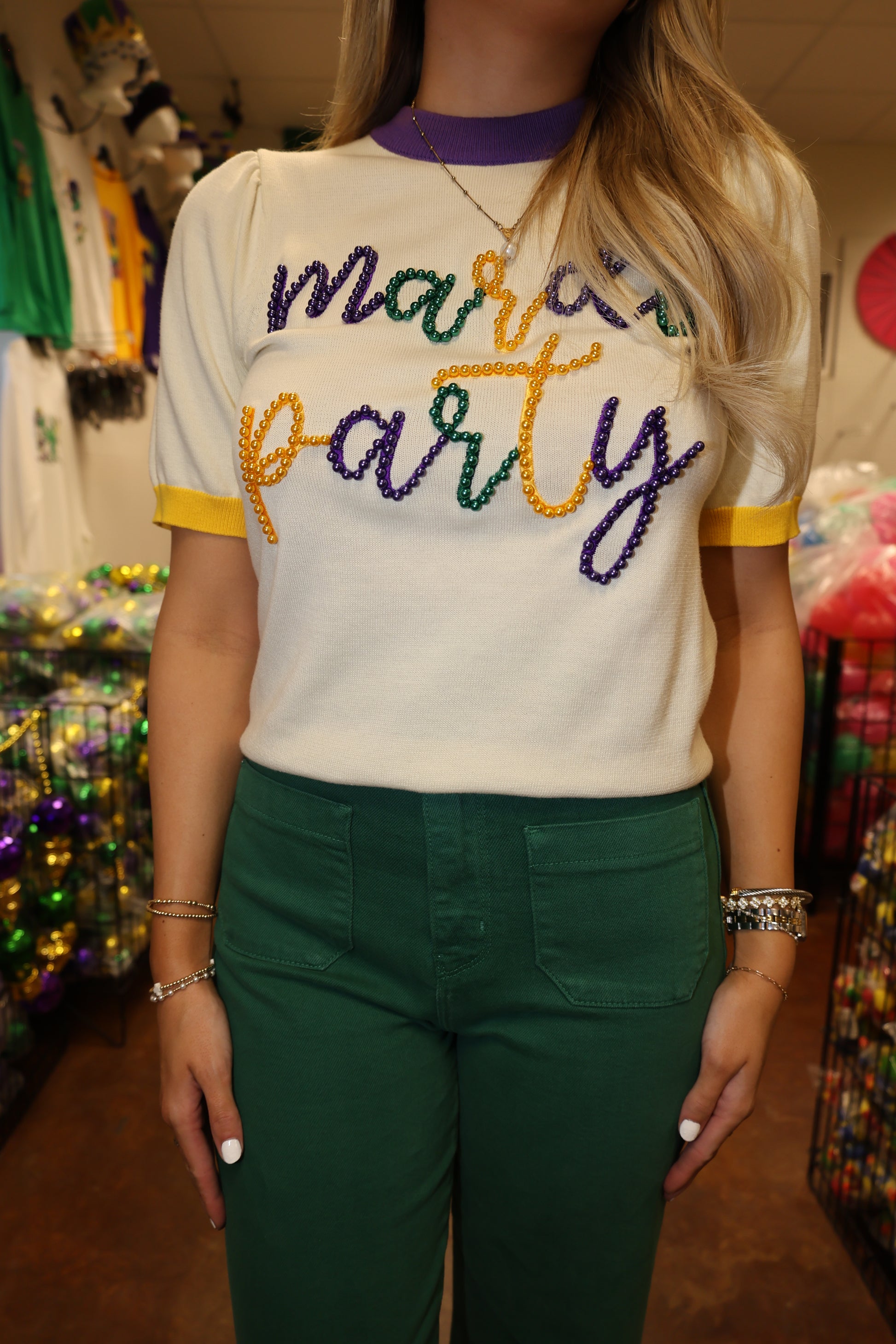 "Join the Mardi Gras fun with our Beading Around Top! This playful purple top is adorned with gold and green beads, bringing an extra dose of quirkiness to your wardrobe. Perfect for a festive night out, get ready to turn heads and collect some beads. Laissez les bons temps rouler!"