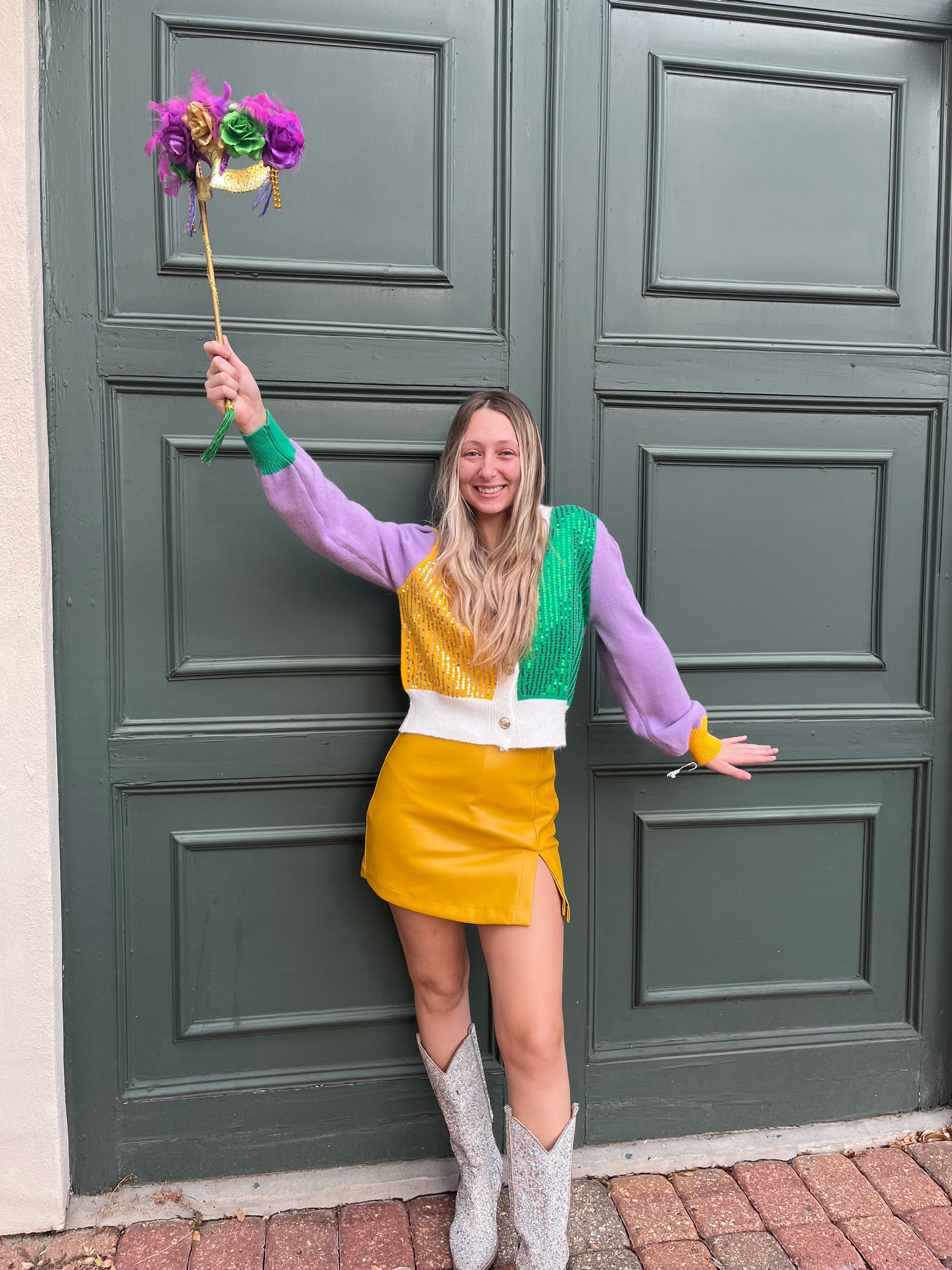 Dress like a queen in our Crown Skort(Gold)! With bold colors of Mardi Gras (purple, gold, green, and yellow), this stylish skort will make you stand out from the crowd. The perfect combination of a skirt and shorts, it's comfortable and fashionable for any occasion. (Bow down a little and get yours!)