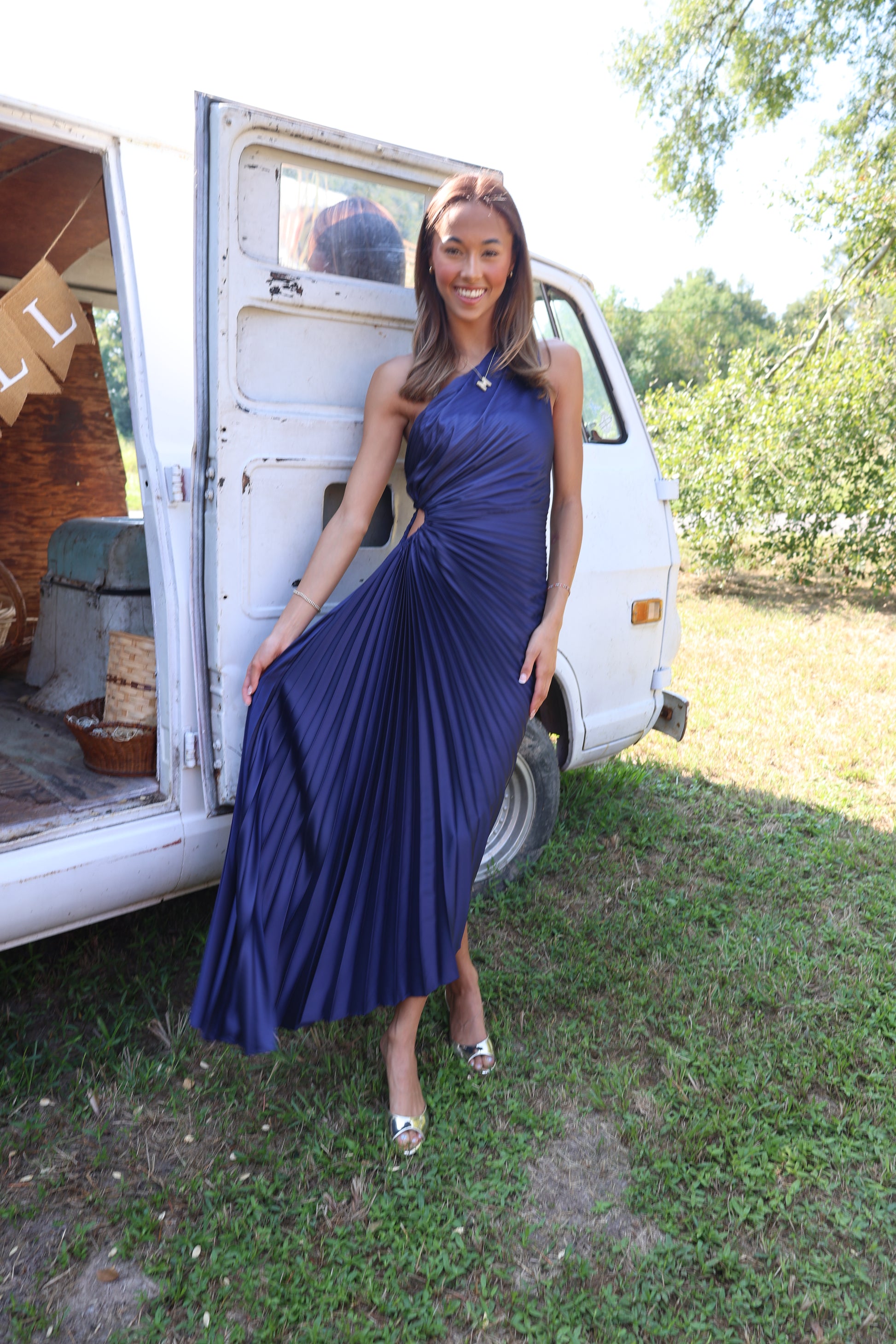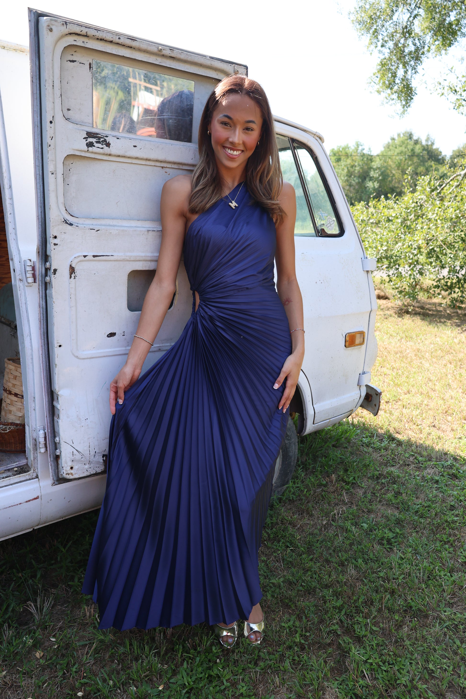 Get ready to dance with this playful navy dress! Its pleated design adds a fun touch, perfect for any fall event, including homecoming. Don't miss out on the chance to dance with this dress! (1 exclamation point)