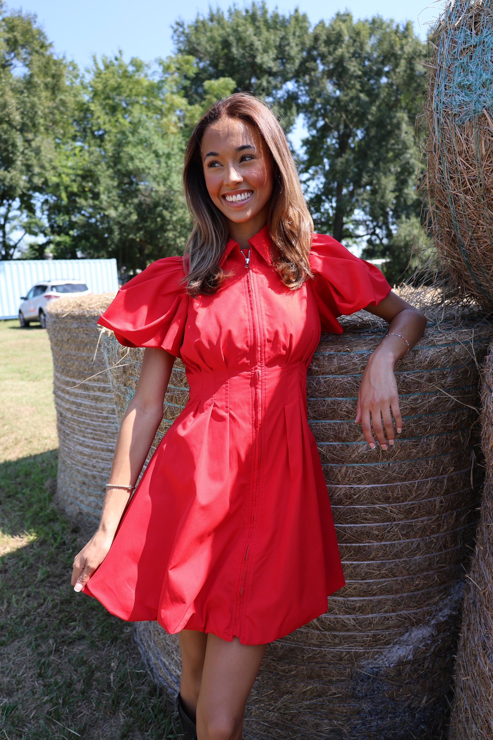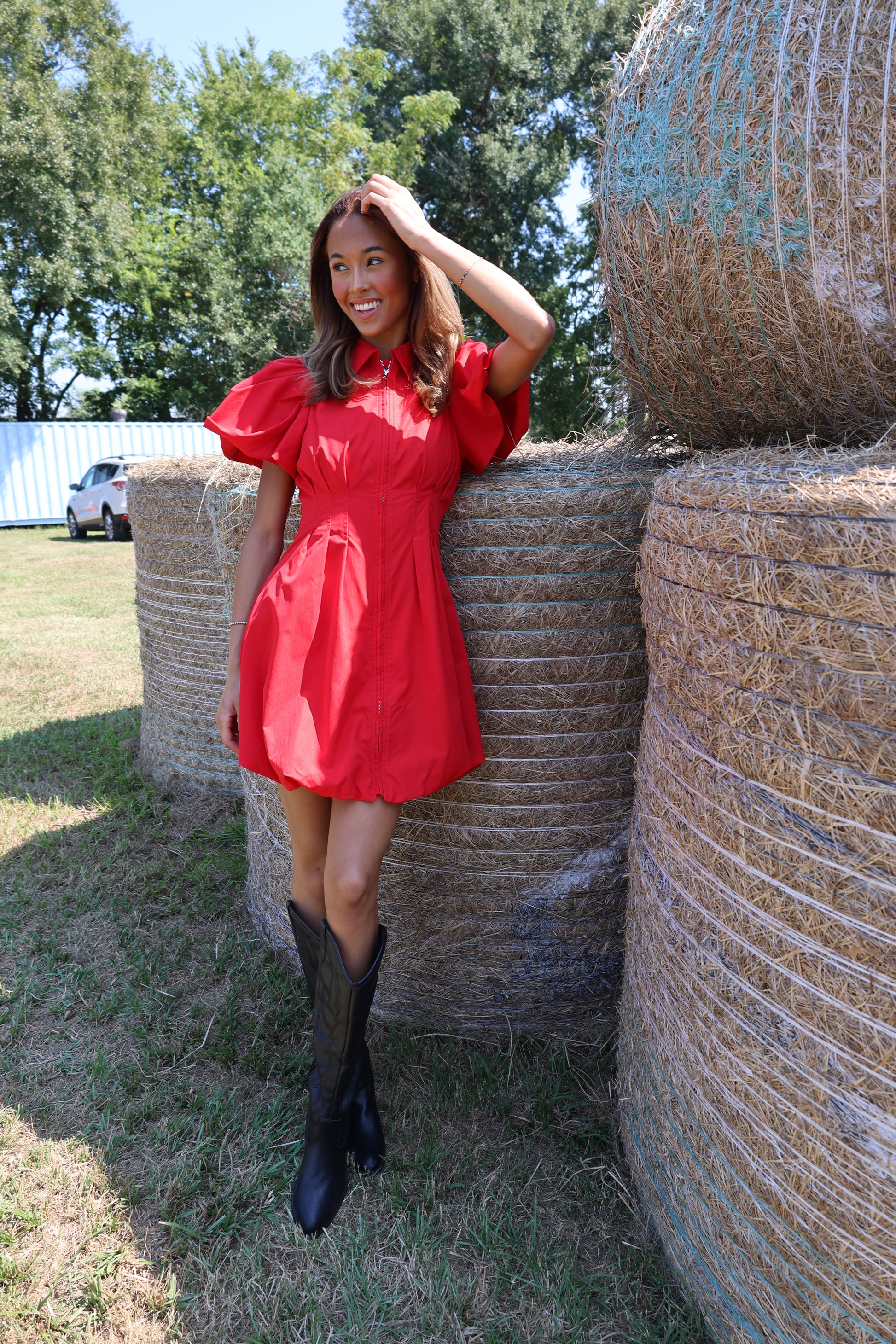 Get ready to rock the town in our new Estelle Dress! This vibrant red dress is perfect for the upcoming fall season, making it a must-have for any fashionista. So why wait? Spice up your wardrobe and stand out from the crowd with this stunning dress. (Red-hot and ready to make a statement!)