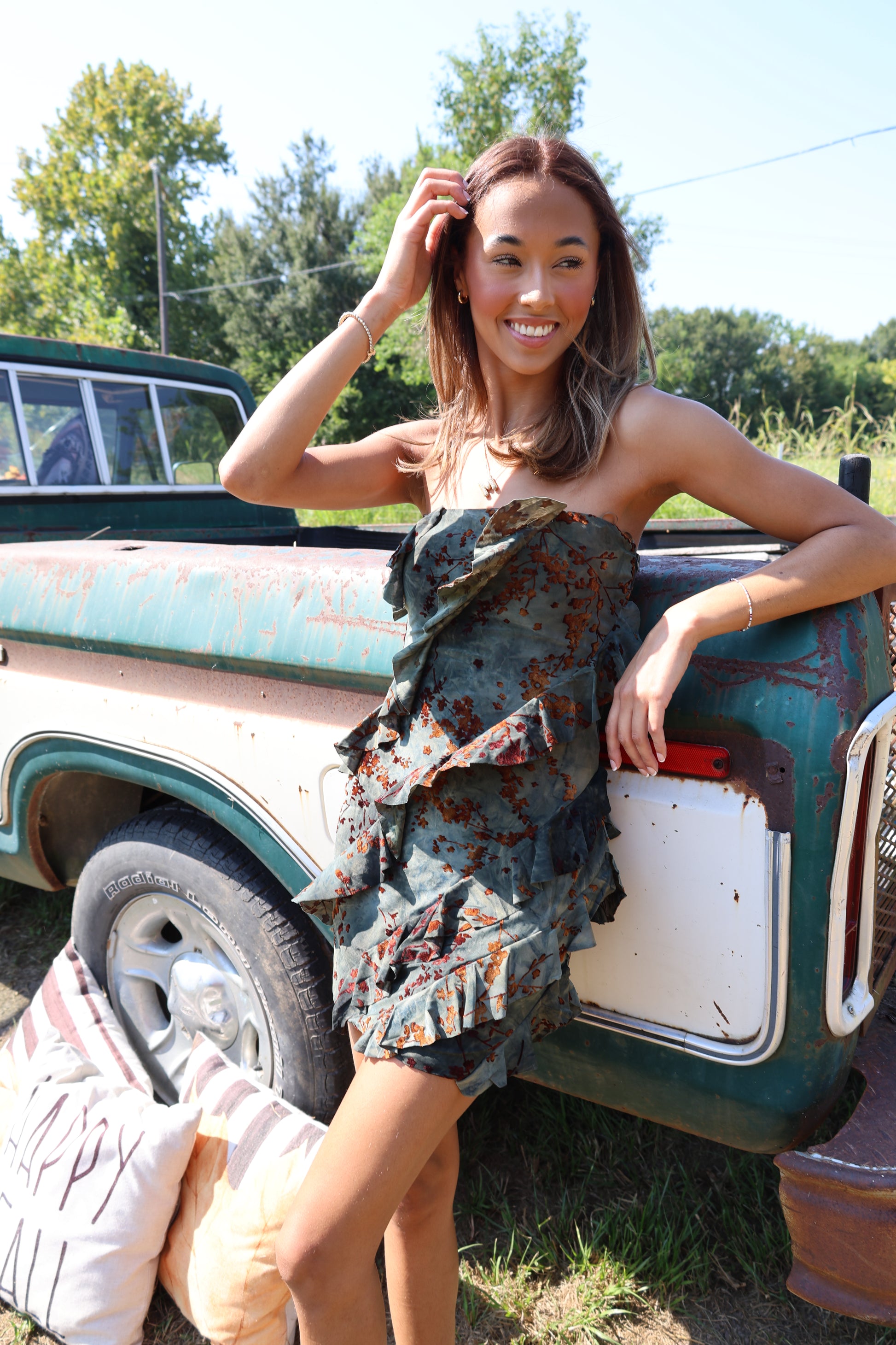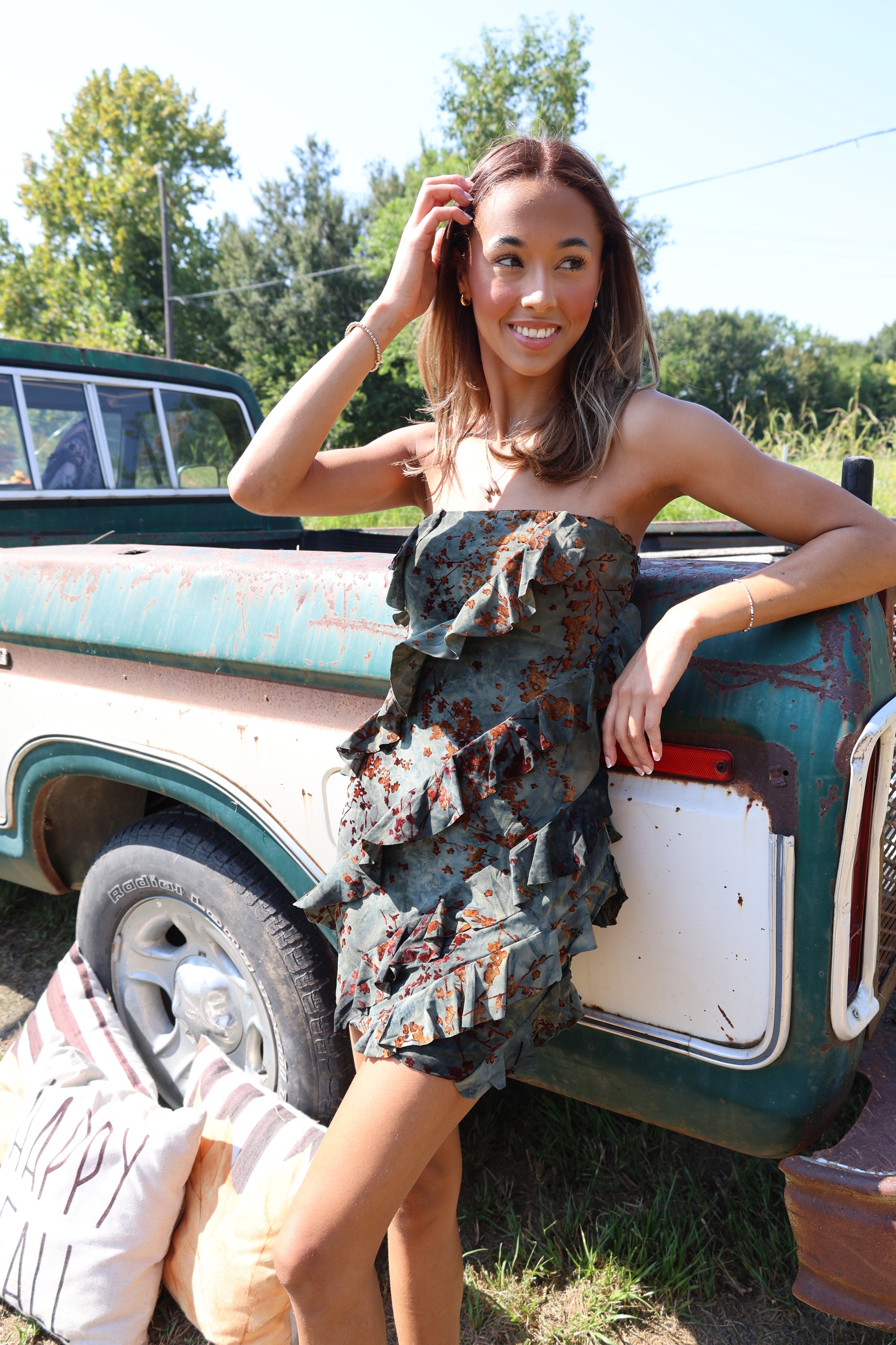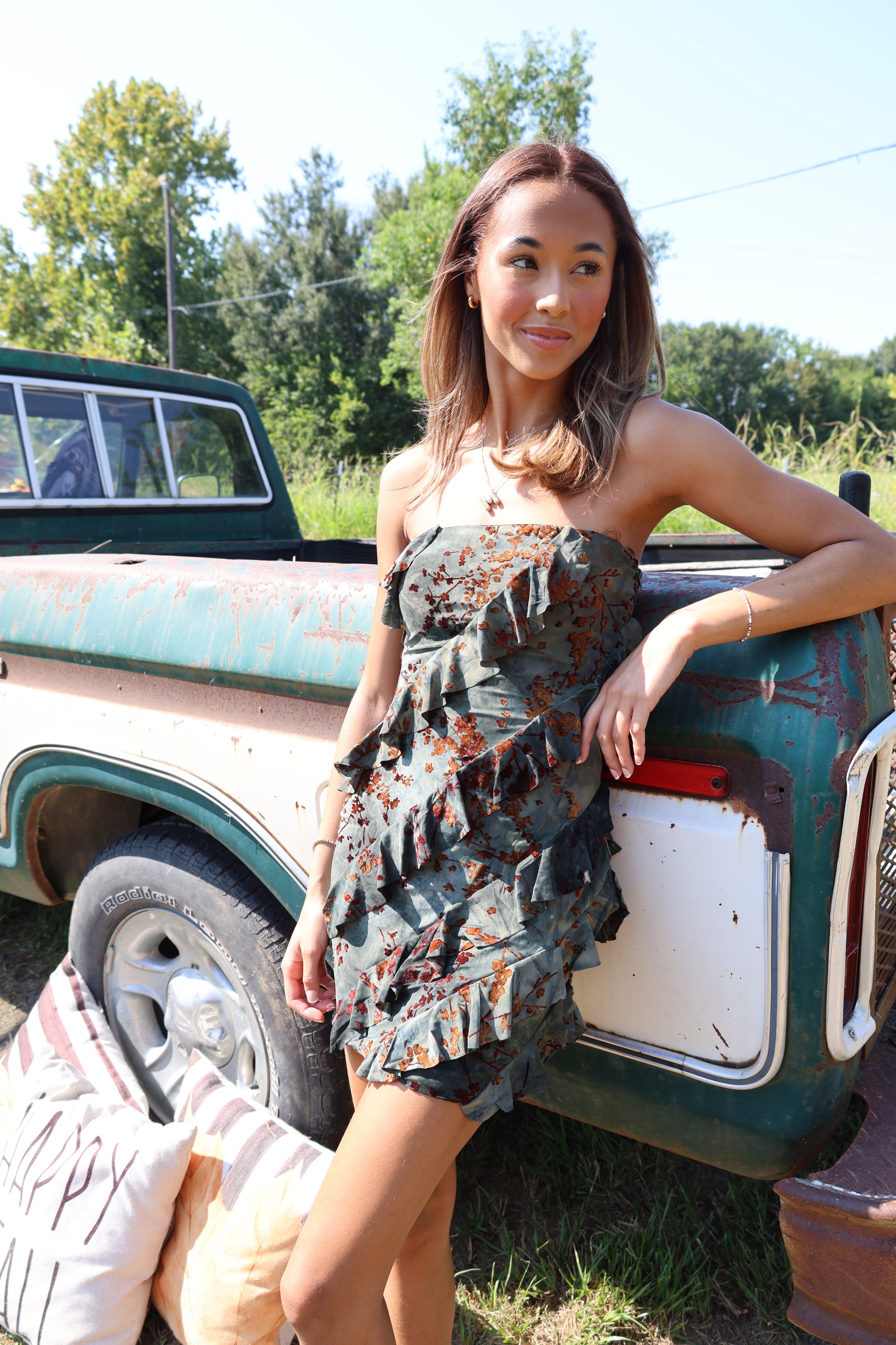 "Get ready to flaunt your fall fashion with this Flocking Dress! With charming ruffles and a playful mini length, this dress will have you feeling flirty and fun. The olive color adds a touch of unique sophistication, while the brown accents tie it all together. Perfect for any occasion!"