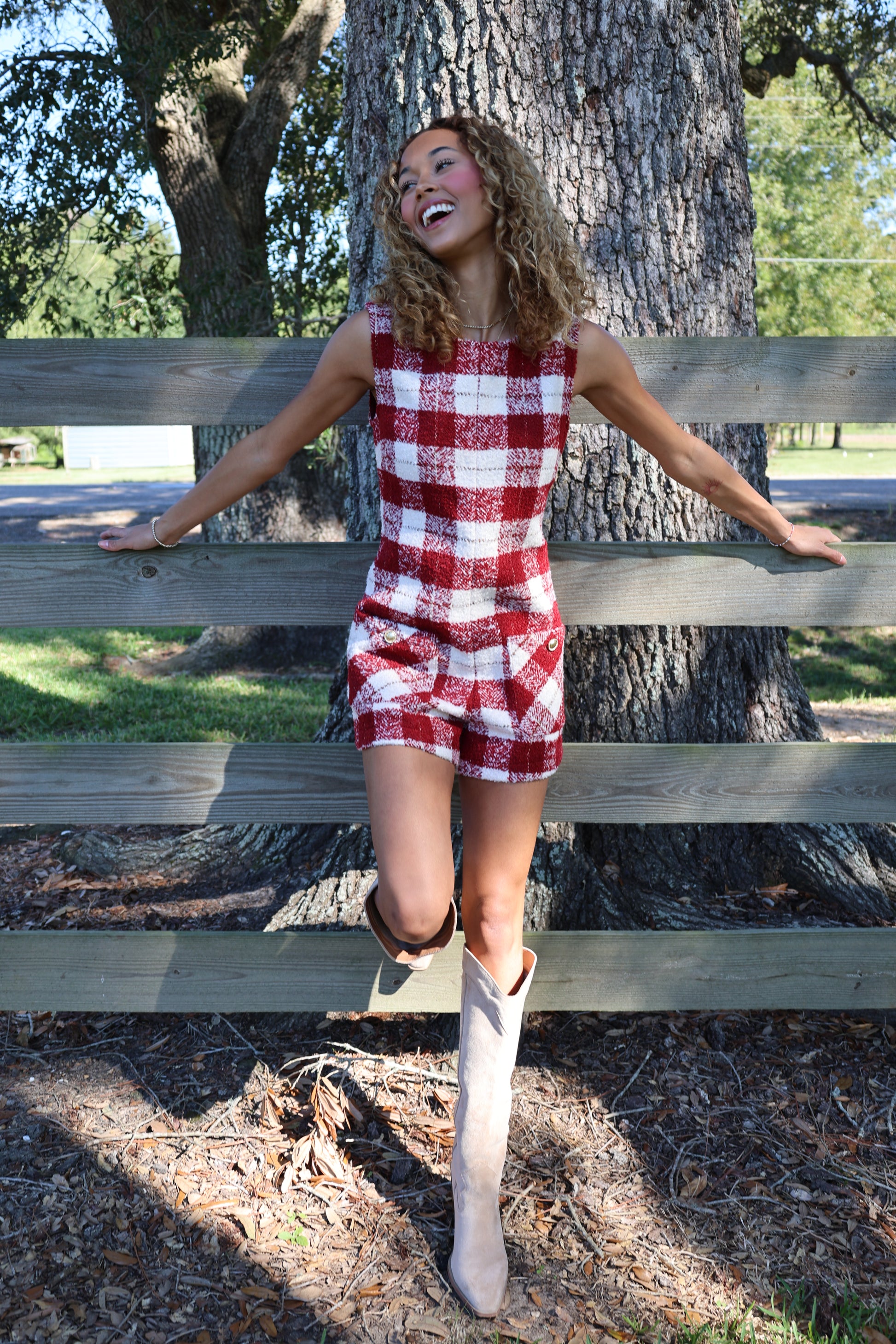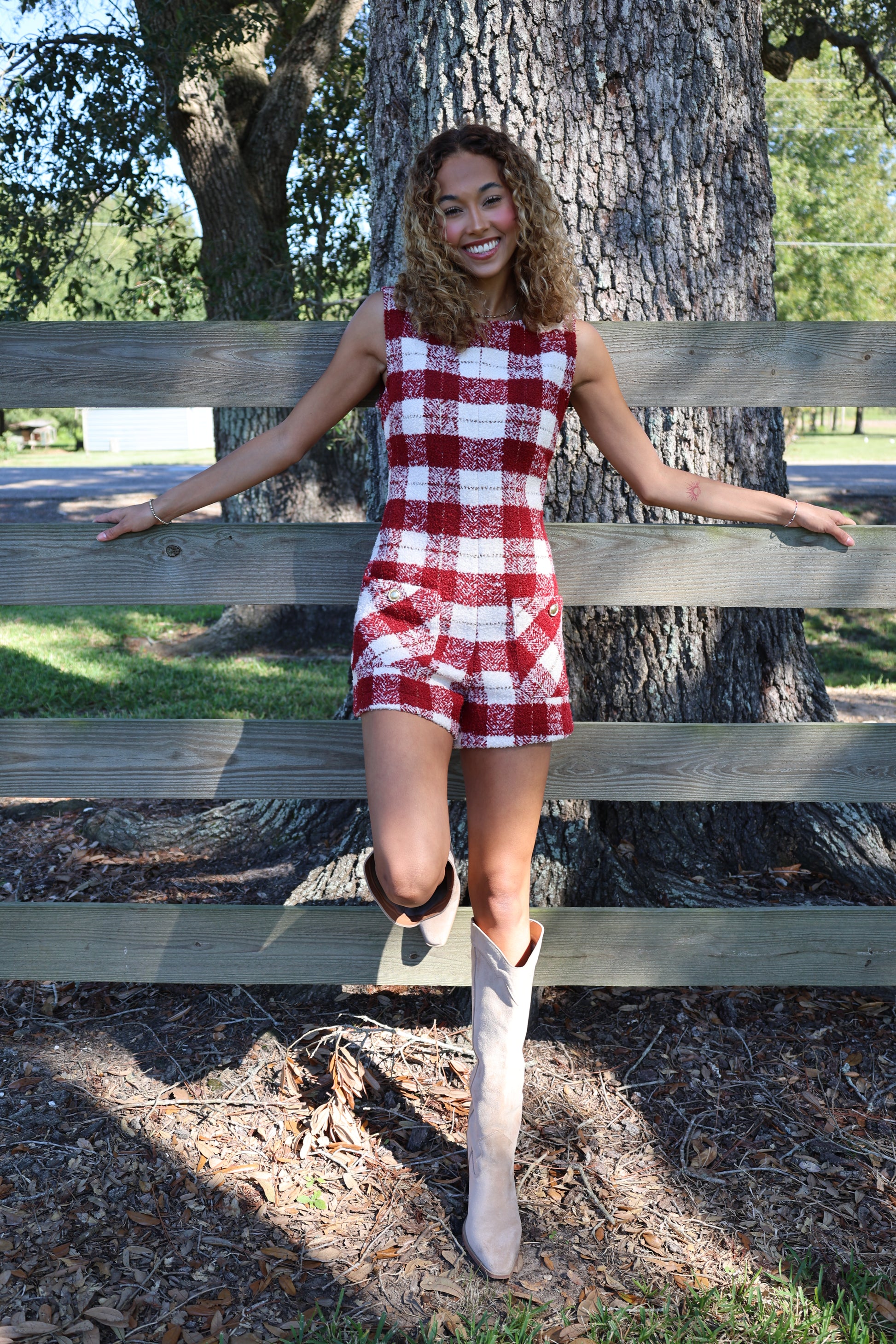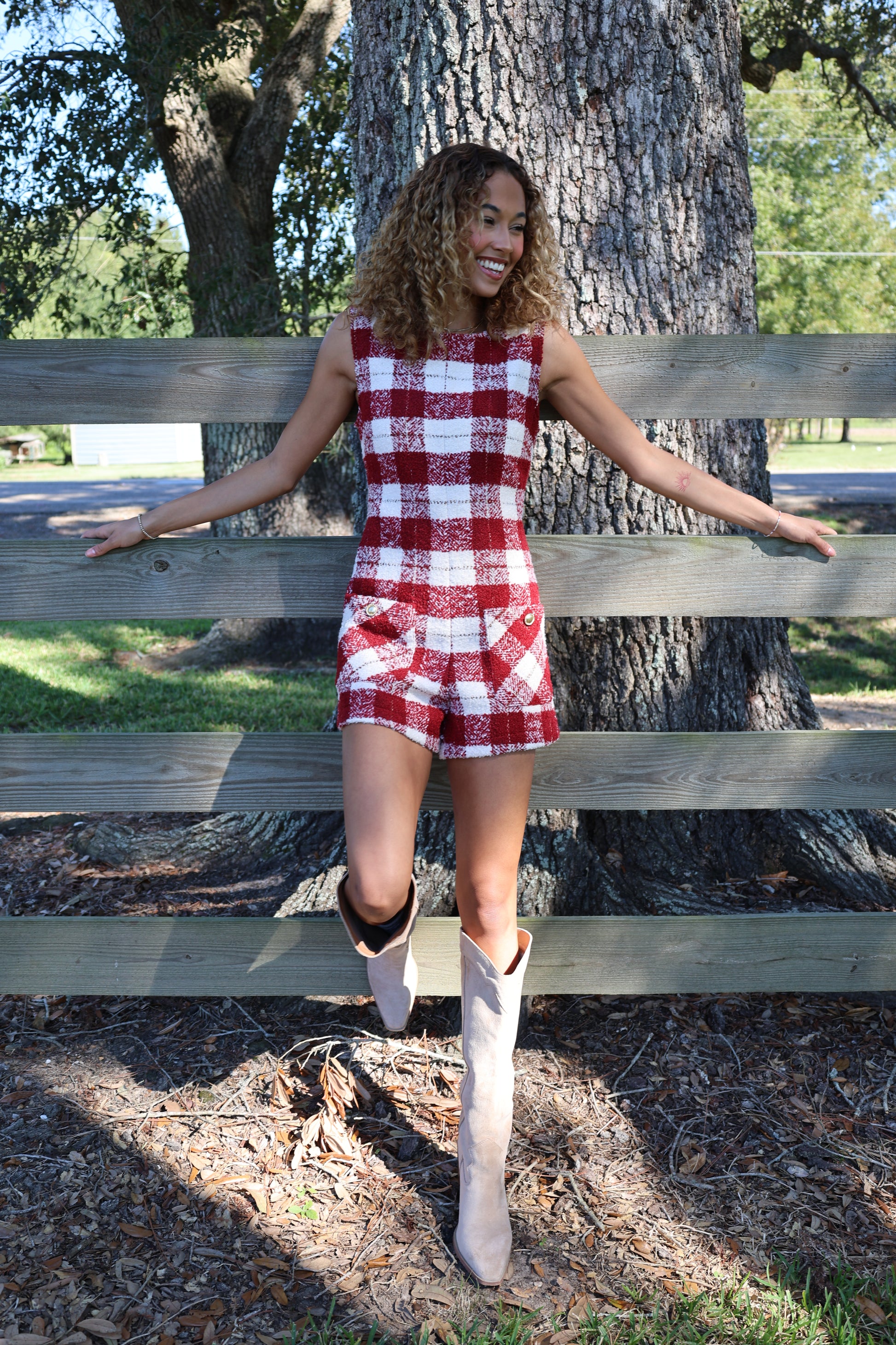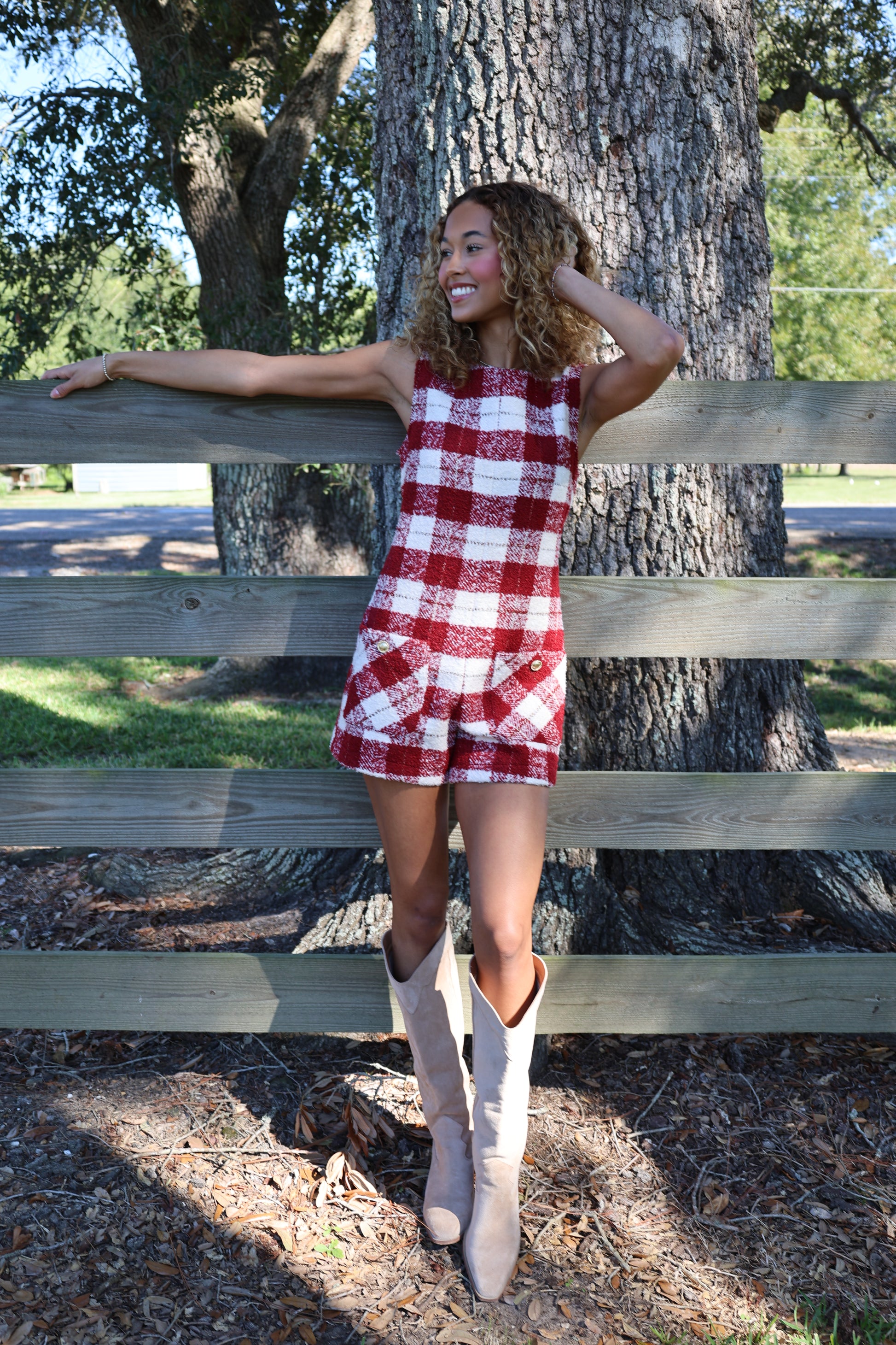 Look red-y for fall in this Kya Romper! Made with cozy tweed, this romper is perfect for those crisp autumn days. And with its playful white accents, you'll stand out in any crowd. Get ready to fall in love with this quirky and fun romper!