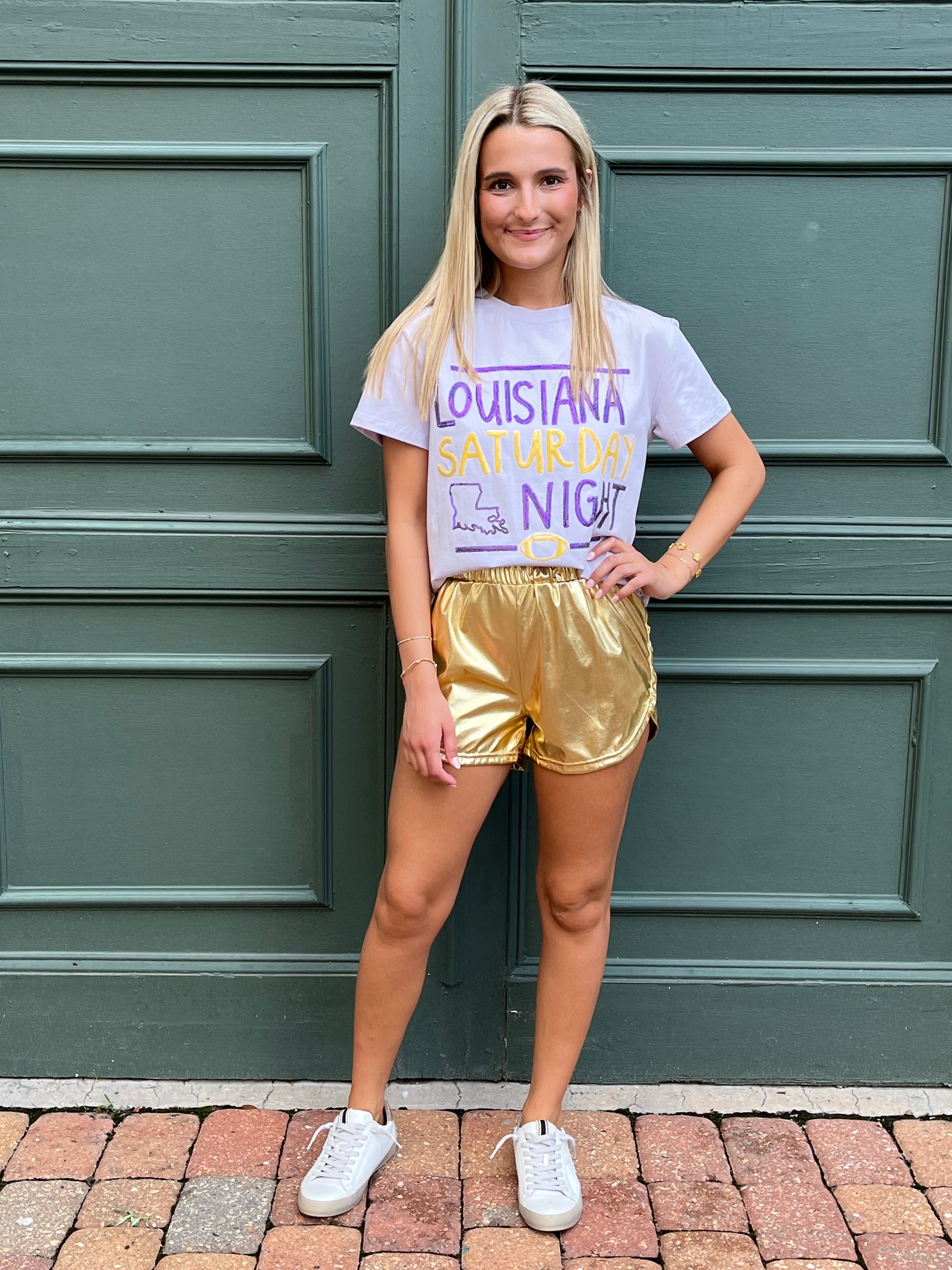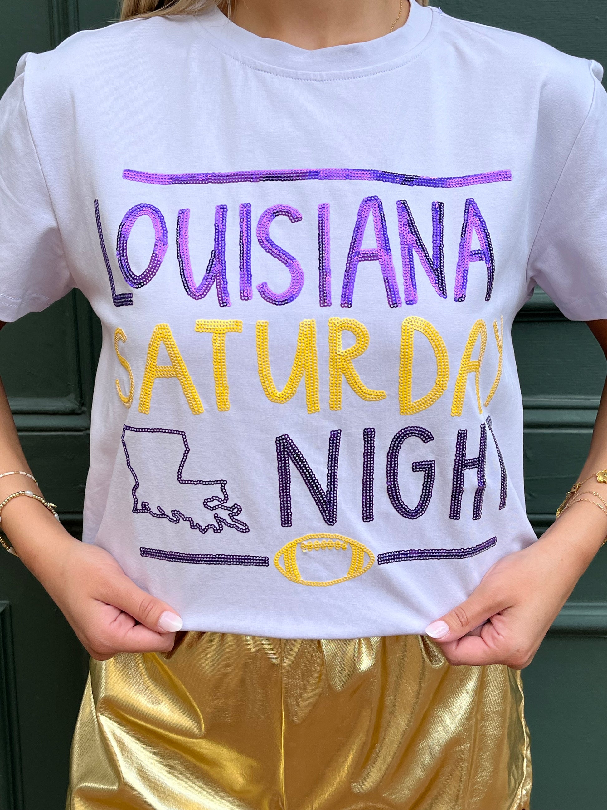 "Turn heads on the dance floor with LA Saturday Night! This dress screams Louisiana Saturday night with its purple and gold color scheme and dazzling sequins. Get ready to party in style! (Hint: perfect for Mardi Gras or any fun night out). Let the good times roll!"