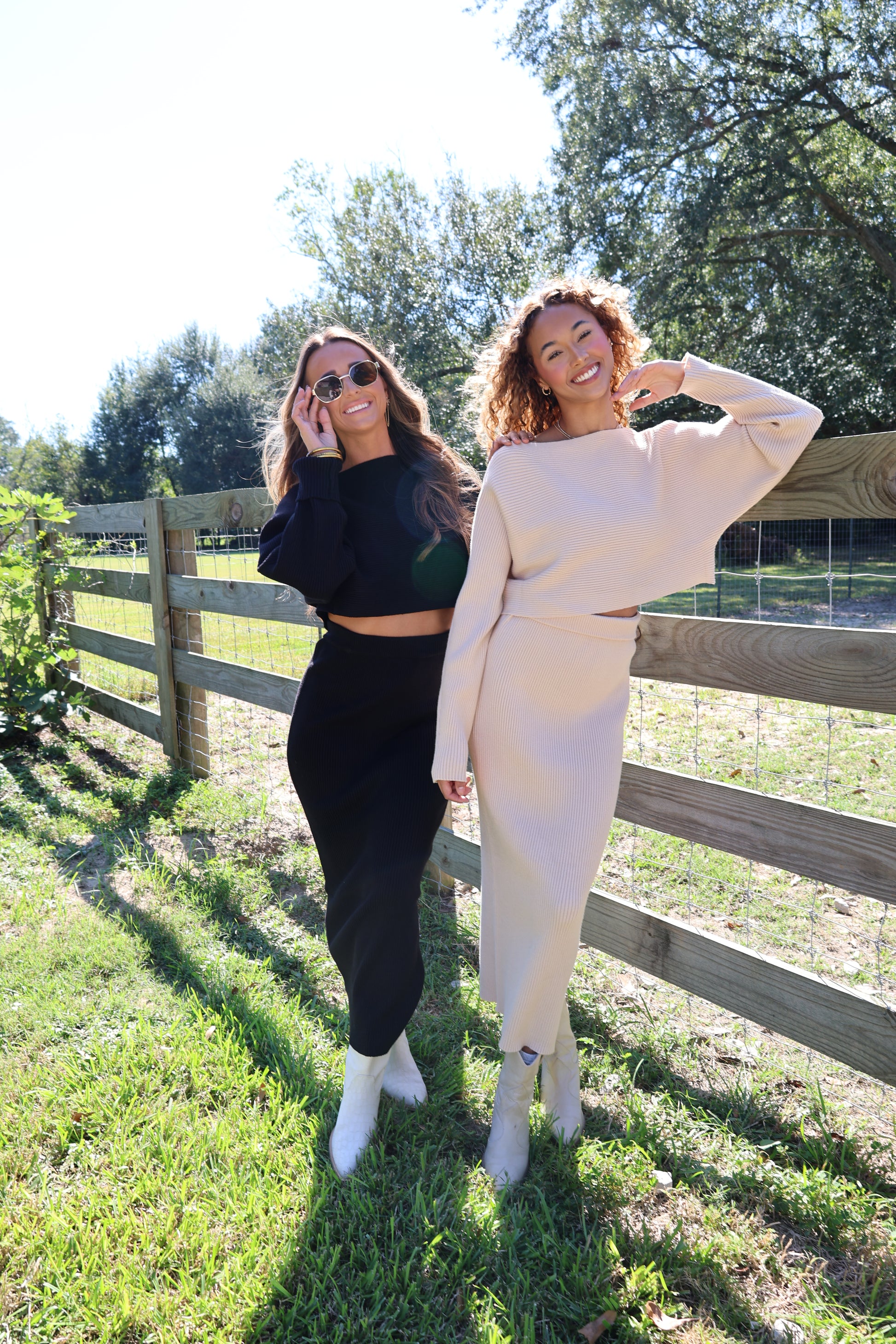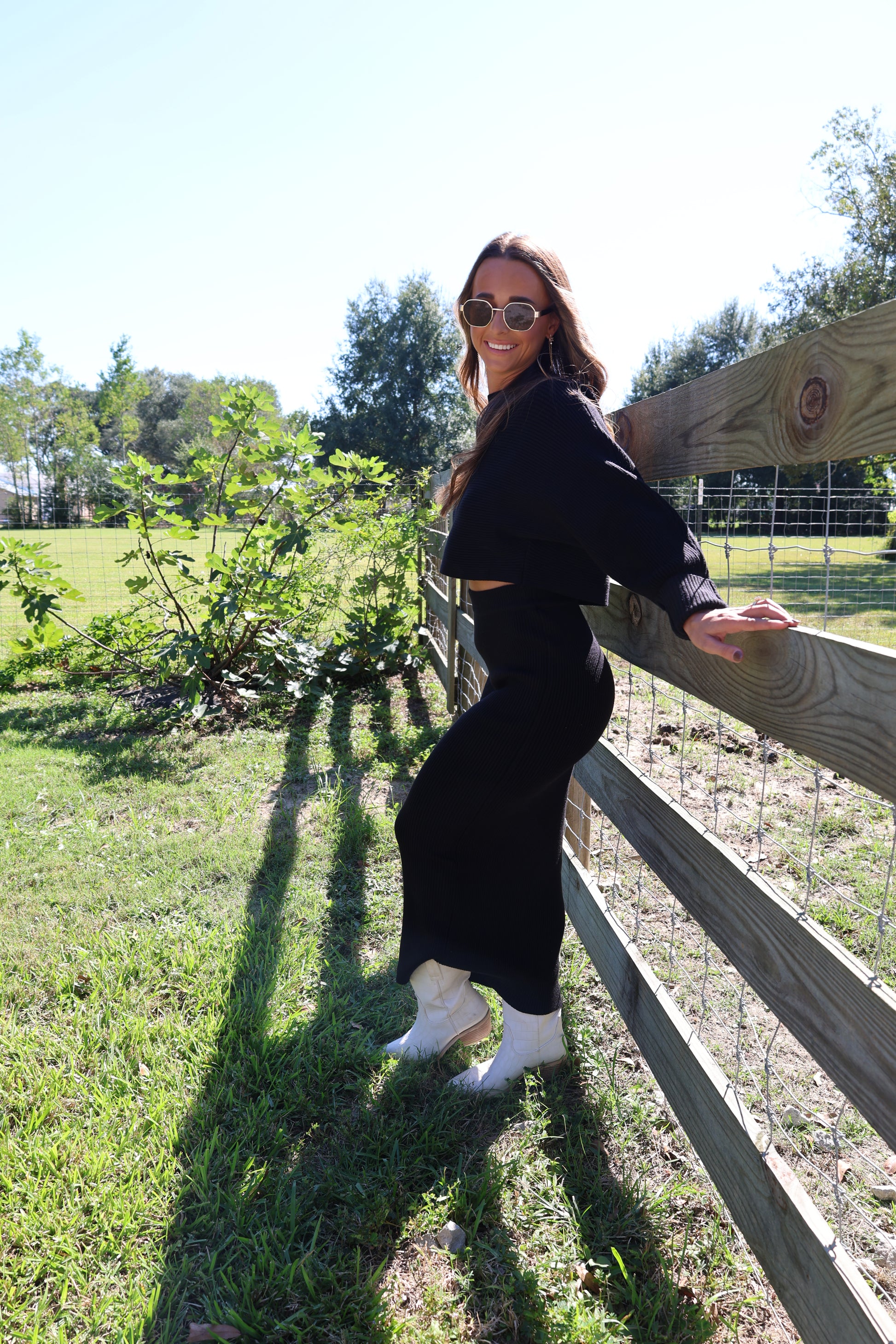 "Get ready for fall with our Midi Set in black! This playful set includes a top, skirt, and sweater, perfect for mixing and matching. Say goodbye to boring outfits and hello to a fun and stylish new look. Stand out from the crowd with our quirky and versatile Midi Set!"