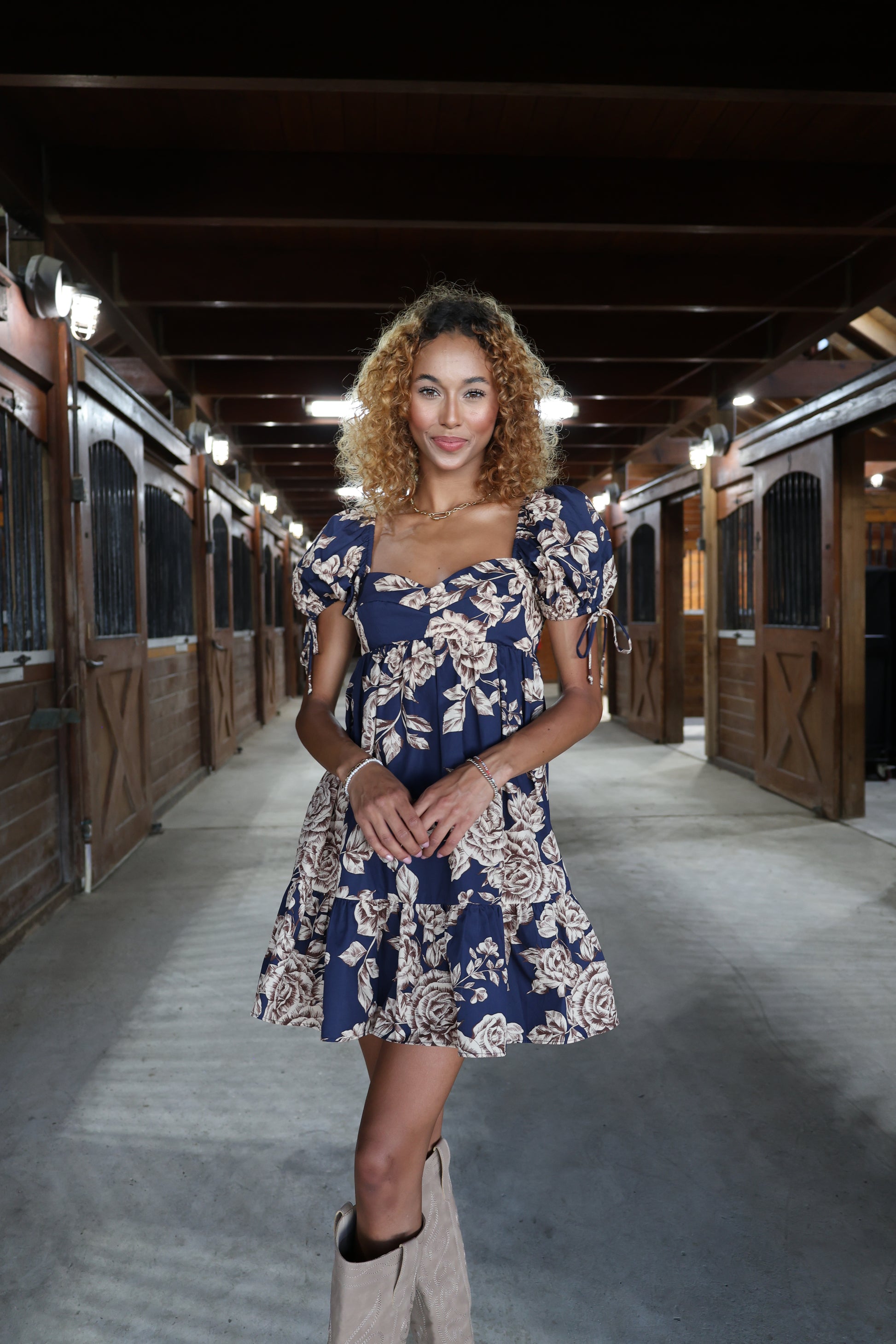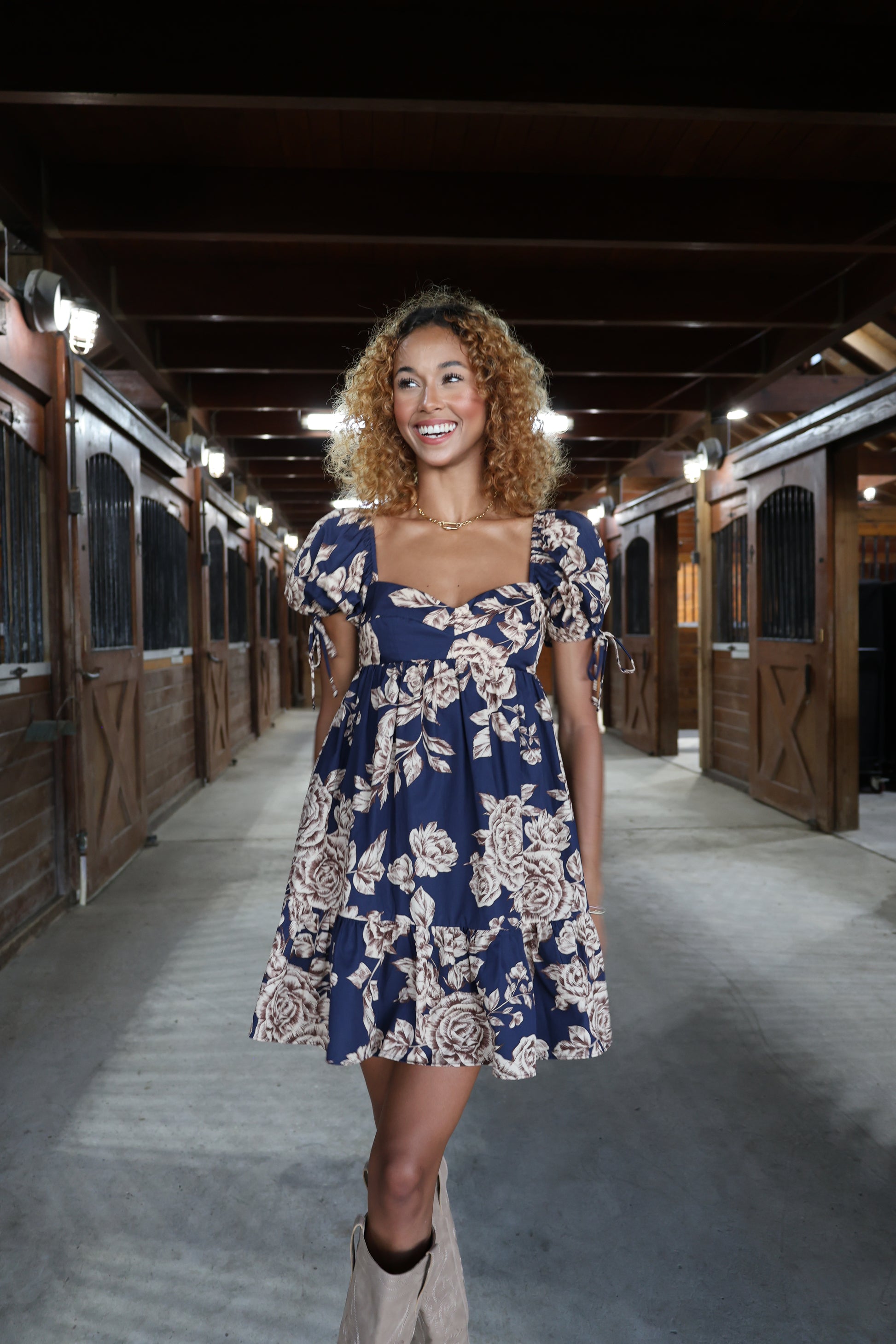 "Transform your wardrobe with the Midnight Dress. This versatile blue dress is perfect for the fall season, and the gold accents add a touch of elegance. Dress to impress, day or night!"
