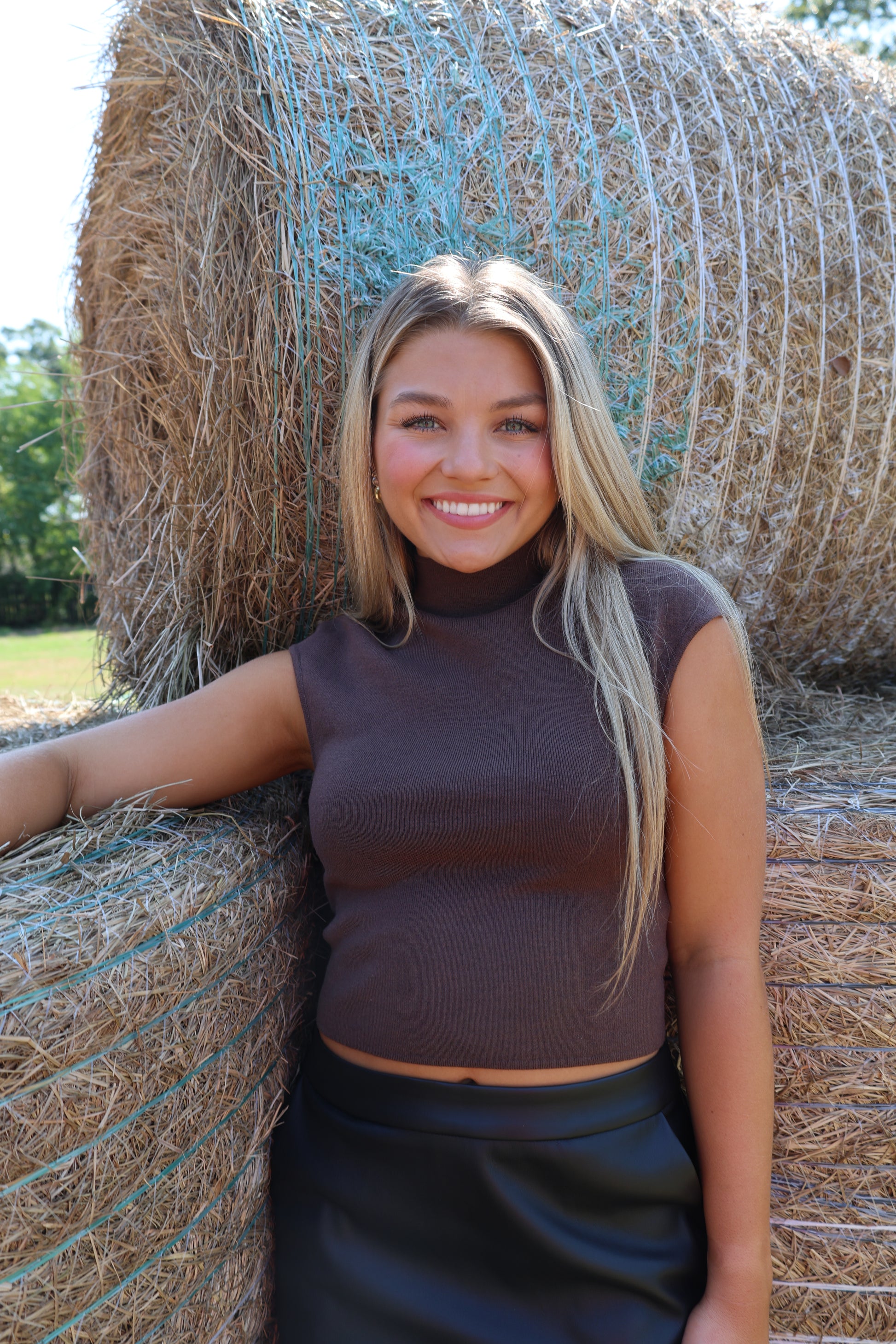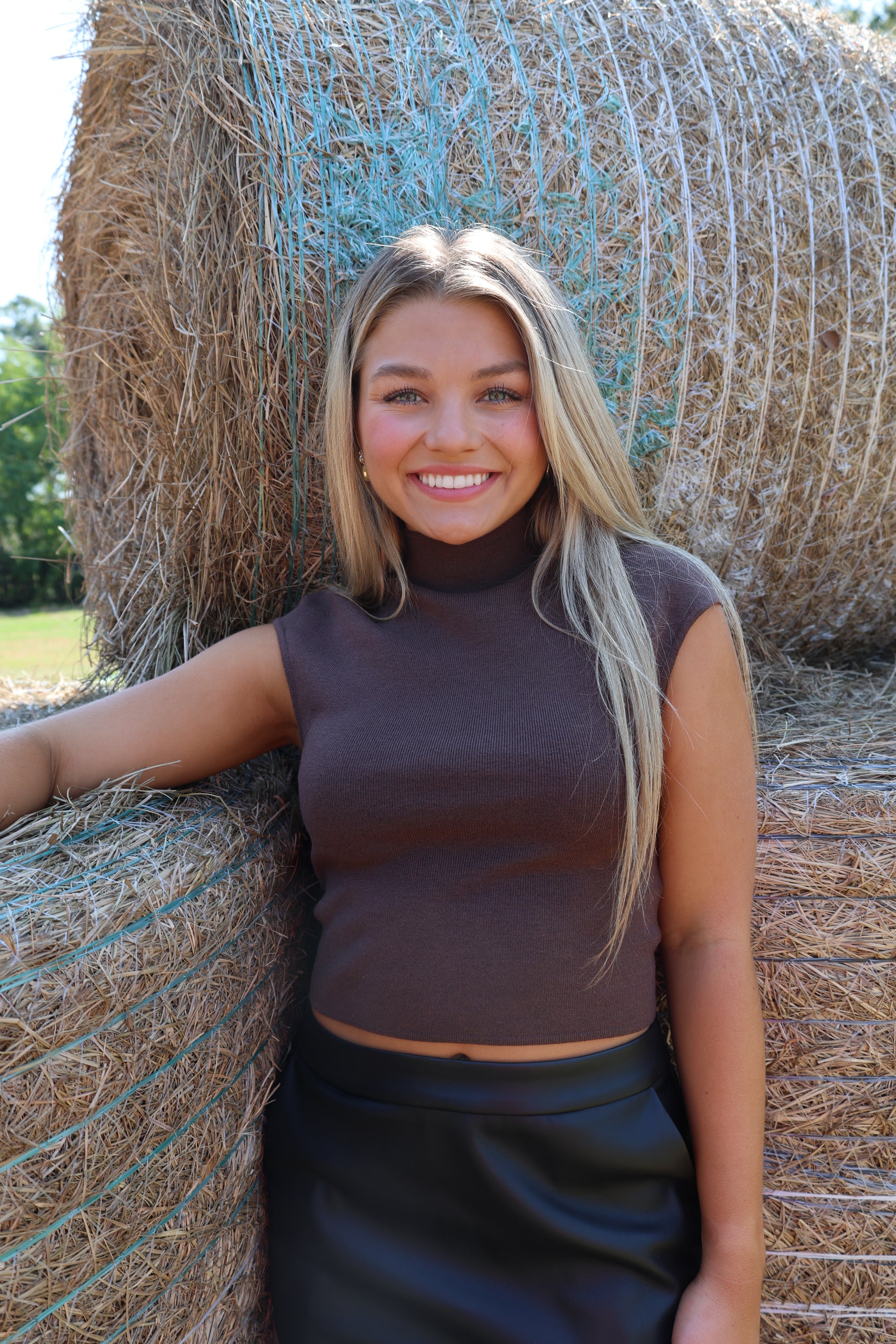 This Mock top in Brown is perfect for Fall photos with the family! The warm brown color is versatile and great for any occasion. Get ready to capture some memorable moments in style with this trendy top.