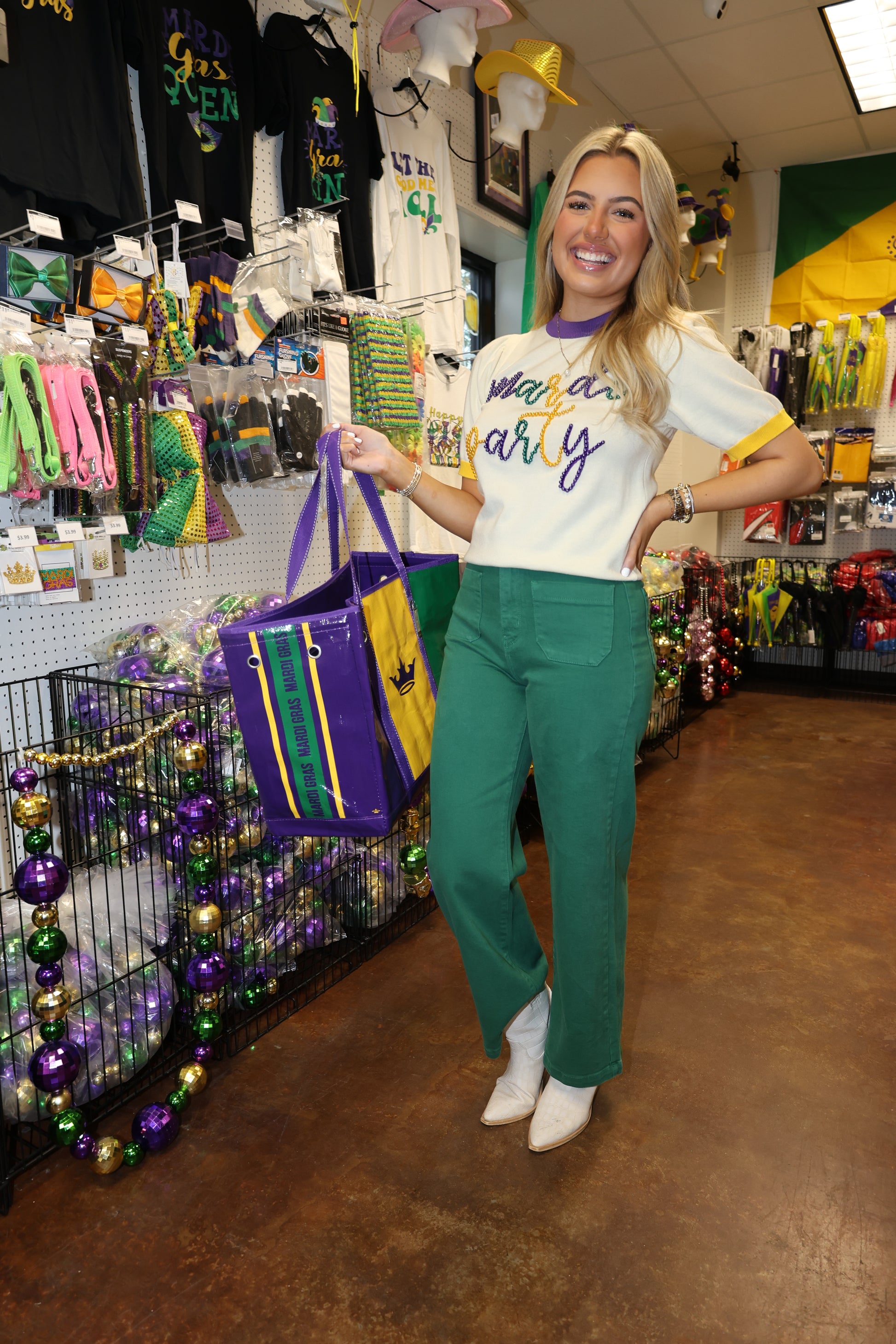 Unleash your festive side with Patch Me Jeans! These green denim jeans are perfect for Mardi Gras or Christmas celebrations. Get ready to make a statement with these unique and playful jeans.