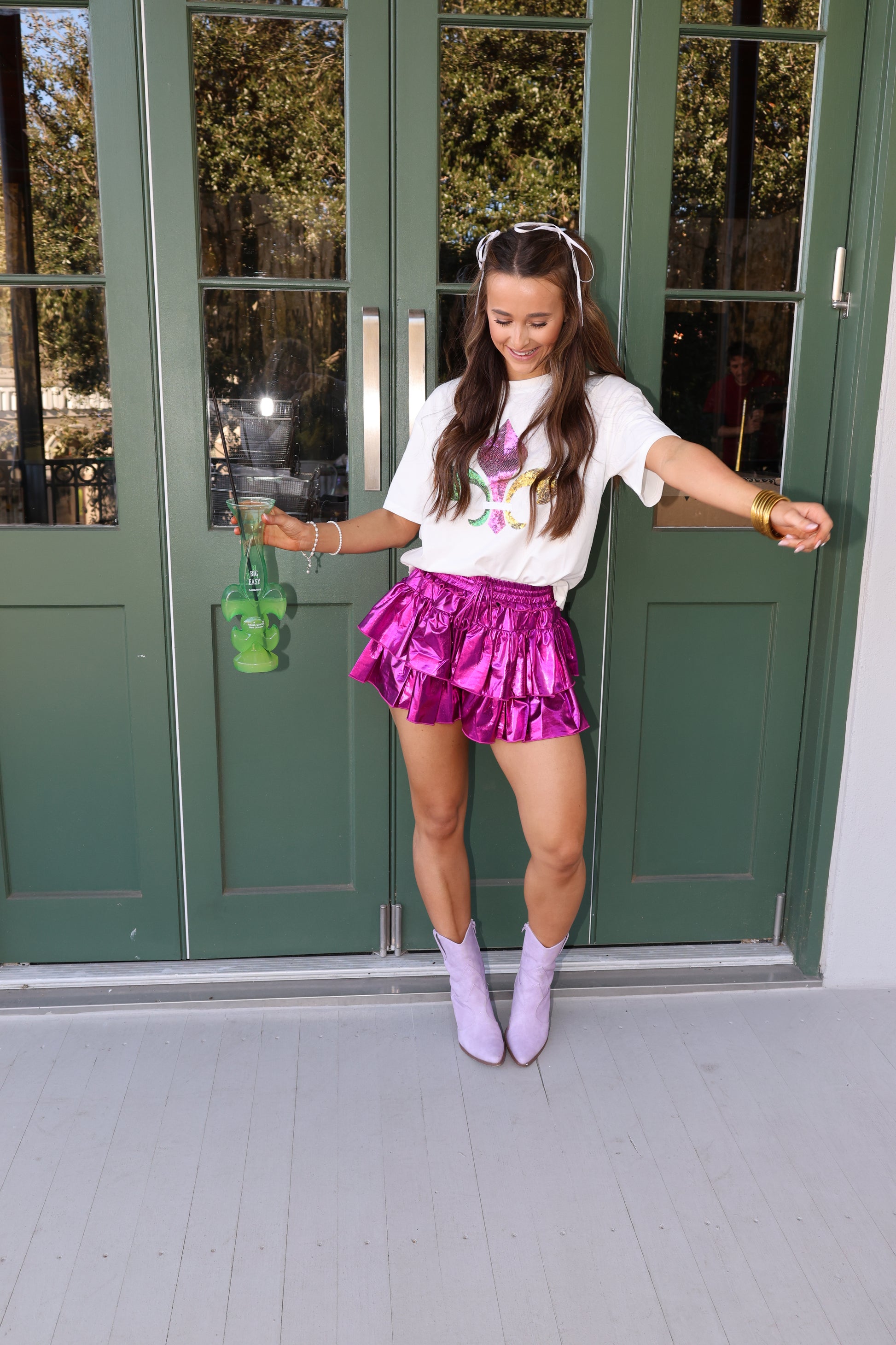 "Get in the Mardi Gras spirit with this playful purple skort! Its metallic sheen adds a touch of shine to any outfit, making you stand out in the best way possible. Perfect for dancing the night away!"