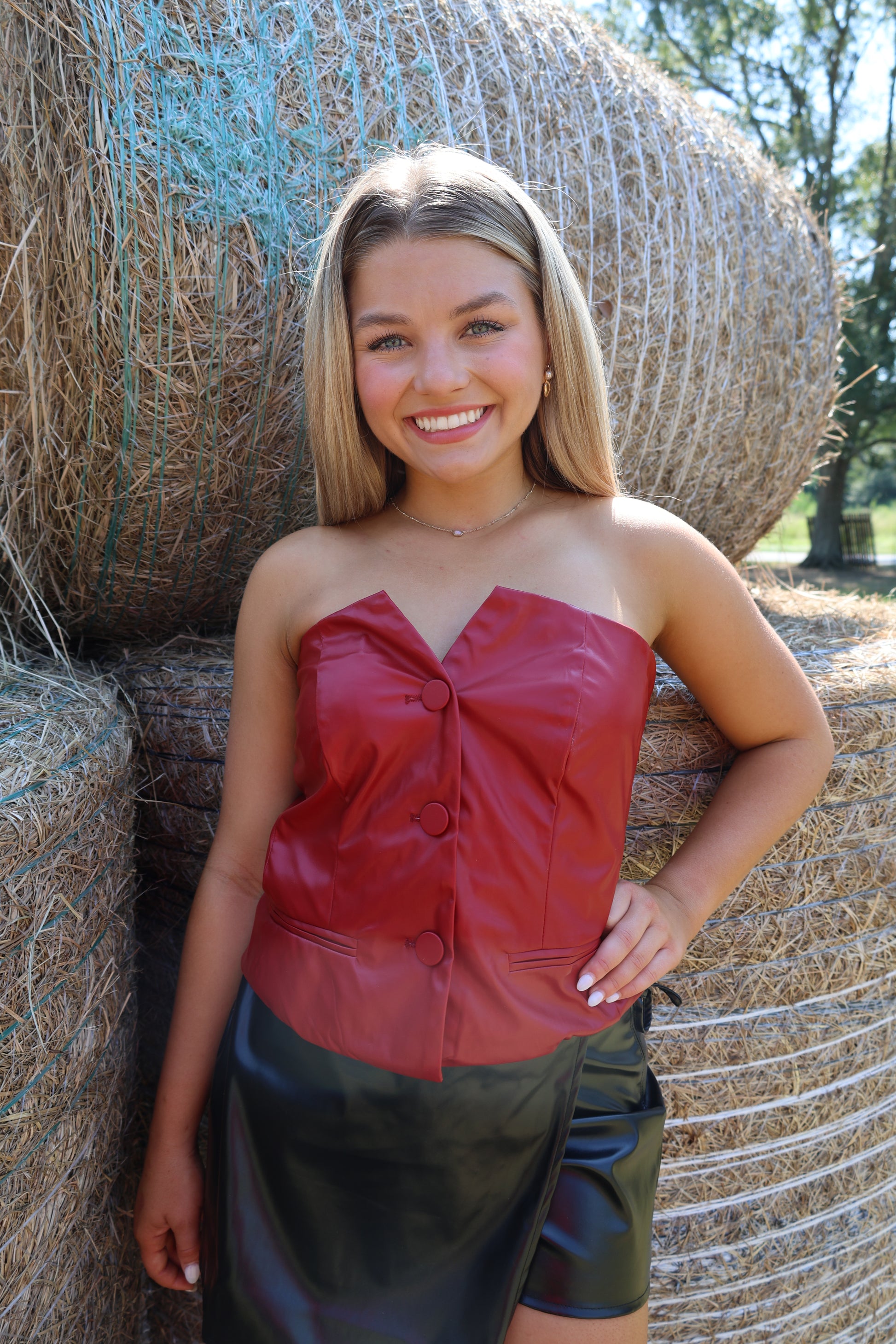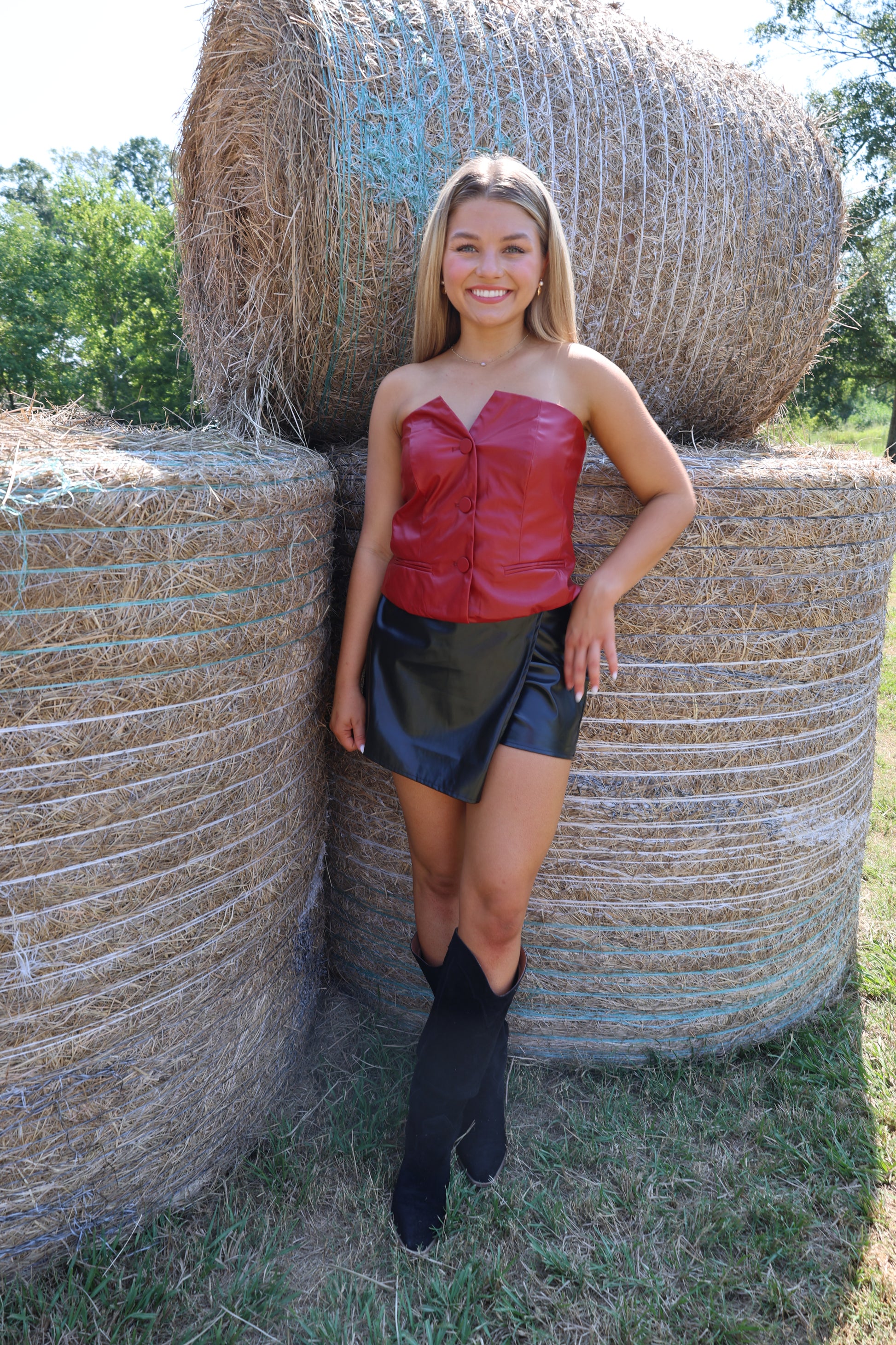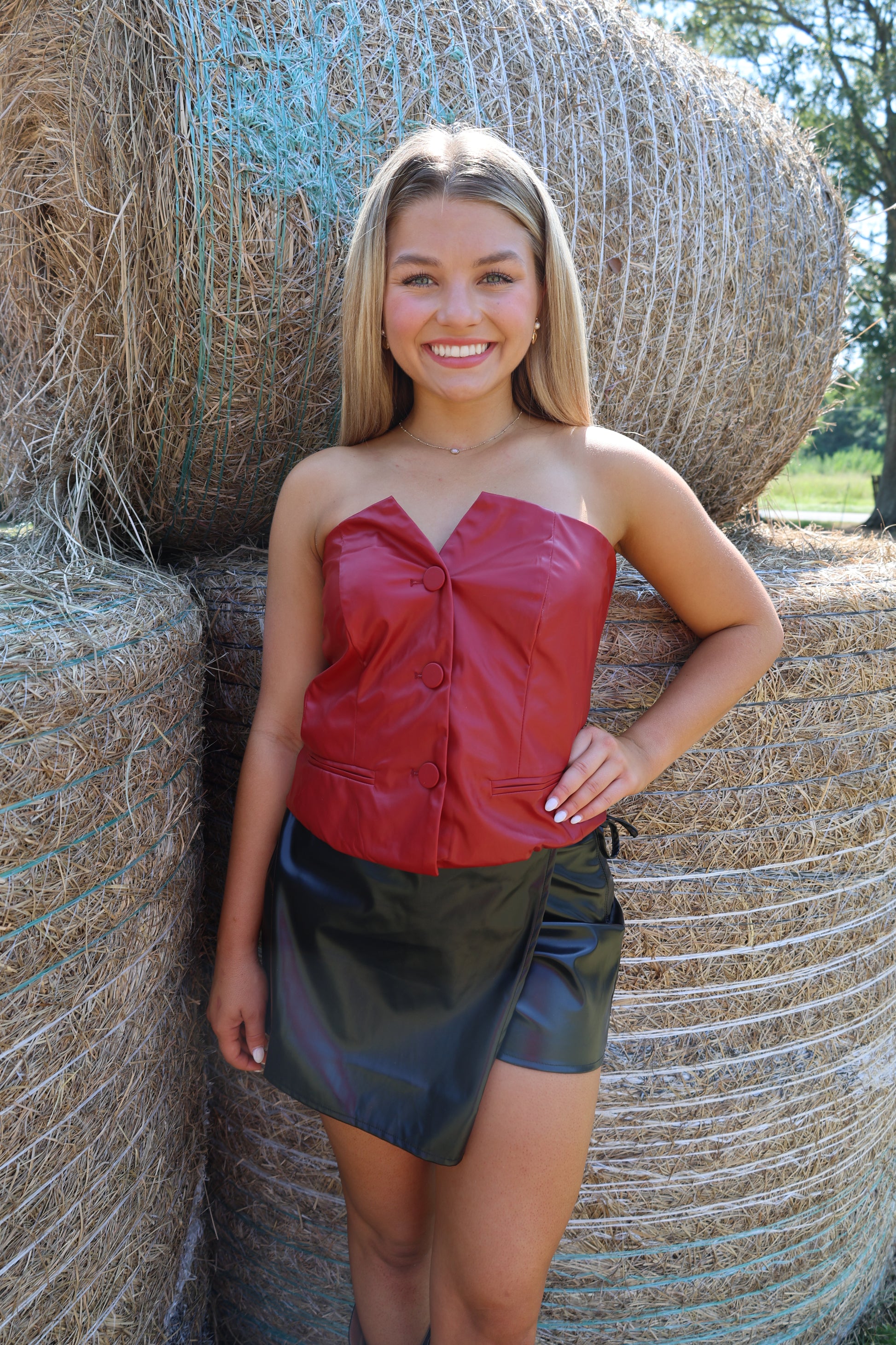 Get ready to make a statement with our Setted Up Top! Made with luxurious leather and featuring a bold red color, this top is perfect for the fall season and game day. Embrace your inner fashionista (and comfort) with this must-have addition to your wardrobe.